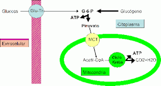 Por otro lado en un proceso anaeróbico, el glucógeno o glucosa en combinación con el Oxígeno dan lugar a 2 moléculas de ácido pirúvico y ATP (Adenoxiltrifofato – molécula de energía). Esta es una de las maneras de obtener energía (ATP) para alimentar a los músculos, pero el ácido pirúvico resultante gracias a la labor de la mitocondria y una enzima catalizadora llamada Piruvato Deshidrogenasa se transforma en más ATP, CO2 y H2O. Por lo tanto se puede decir que se aprovecha muchísimo más la glucosa y el glucógeno.